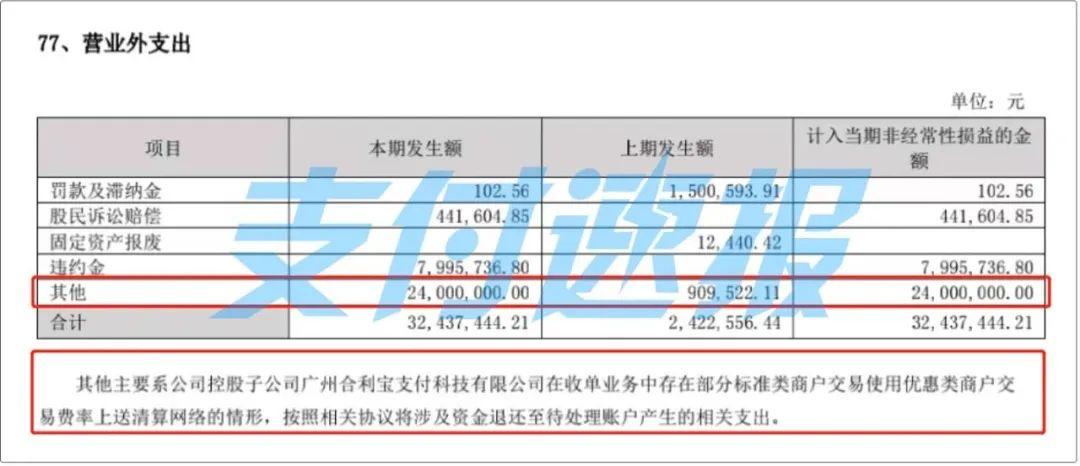 子公司聯動優勢在收單業務中存在部分標準類商戶交易使用商戶交易費率上送清算網絡的情形,公司按照相關協議將涉及資金分批退還至待處理賬戶,基于謹慎性原則,公司將所涉及資金計入營業外支出。公告中,營業外支出的其他金額為58,655,047.10元