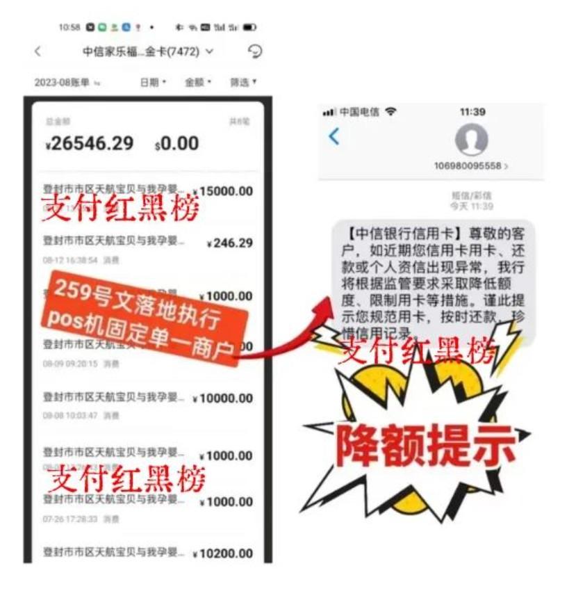 也有持卡人反饋,隨這259號文落地執行POS機固定單一商戶,自己刷卡都顯示登封市市區航天寶貝與我孕嬰店。同時自己也收到了中信銀行信用卡的“警告短信”!