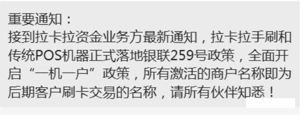 9月13日,行業龍頭老大拉卡拉率先通知全面落實,執行一機一碼政策;