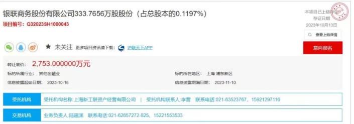 上海產權交易所掛出一則產權轉讓信息,項目名稱為銀聯商務股份有限公司333.7656萬股股份(占總股本的0.1197%),轉讓底價為2753萬元。此次股權轉讓,并不會對銀聯商務的經營造成影響。