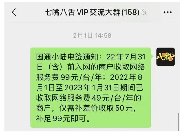 通知內(nèi)容顯示,今天上午開(kāi)始,國(guó)通星驛付旗下星收寶、陸pos普通版、小陸19,小陸20,小陸21普通版,陸POS豪華版等產(chǎn)品,將對(duì)在2023年3月31日之前入網(wǎng)的商戶收取網(wǎng)絡(luò)服務(wù)費(fèi)99元(陸pos穩(wěn)定版、陸易付、小陸穩(wěn)定版產(chǎn)品不受影響)。