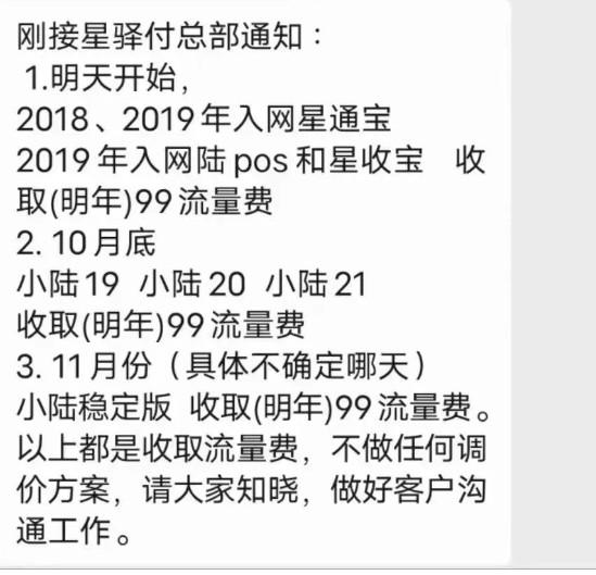 1.明天開(kāi)始,2018、2019年入網(wǎng)星通寶2019年入網(wǎng)陸pos和星收寶收取(明年)99流量費(fèi)2.10月底小陸19 小陸20小陸21收取(明年)99流量費(fèi)3.11月份(具體不確定哪天)小陸穩(wěn)定版收取(明年)99流量費(fèi)。以上都是收取流量費(fèi),不做任何調(diào)價(jià)方案,請(qǐng)大家知曉,做好客戶溝通工作。