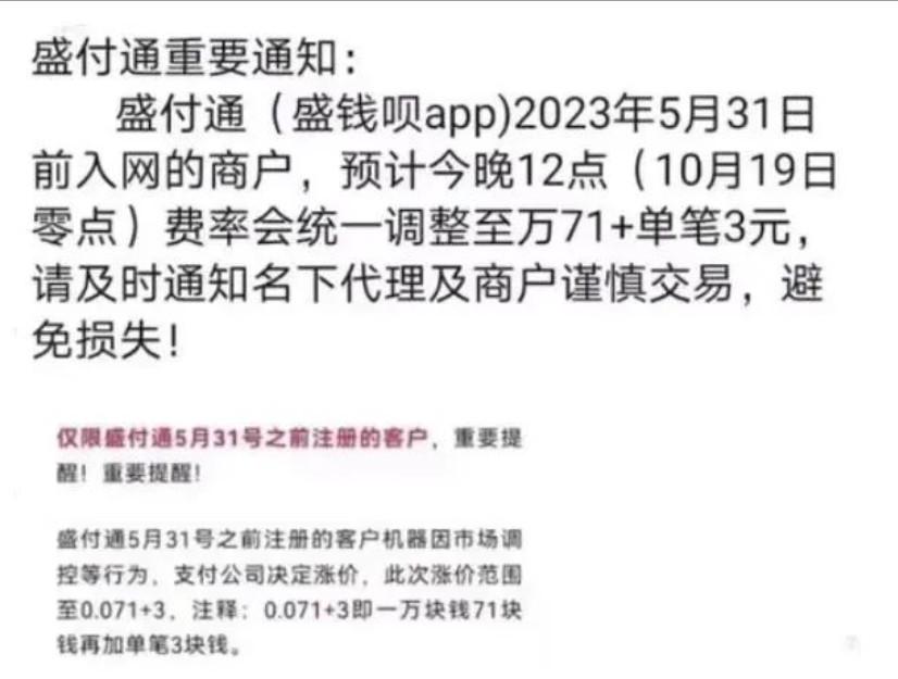 盛付通(盛錢唄app)費率會統一調整至萬71+單筆3元 lakala 2年前 ( 2023-10-24 ) 657 盛付通重要通知:盛付通(盛錢唄app)2023年5月31日前入網的商戶,預計今晚12點(10月19日零點)費率會統一調整至萬71+單筆3元,請及時通知名下代理及商戶謹慎交易,避免損失!僅限盛付通5月31號之前注冊的客戶,重要提醒!重要提醒!盛付通5月31號之前注冊的客戶機器因市場調控等行為,支付公司決定漲價,此次漲價范圍至0.071+3,注釋:0.071+3即一萬塊錢71塊錢再加單筆3塊錢。 The End 標簽:博主很懶,并沒有設置標簽