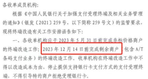 259號文中明確要求在2023年12月14日前完成剩余商戶的終端改造工作。各支付公司估計(jì)在12月14日后政策執(zhí)行完。現(xiàn)在離規(guī)定時(shí)間越來越近,各支付公司也不會在風(fēng)口的時(shí)候頂風(fēng)作案,后續(xù)只會越來越合規(guī)。