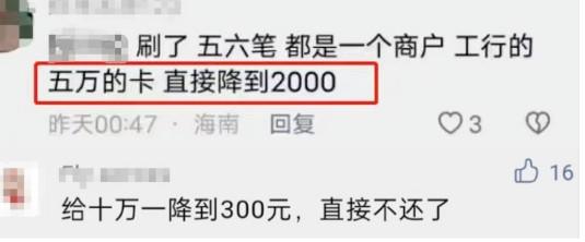有持卡人表示,自己十萬額度的卡被降到5000元,降額幅度額度之大。此外還有持卡人在同一個(gè)商戶多筆刷卡,五萬額度直接降到2000元。