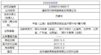 據小編了解,通聯支付成立于2008年10月,創始人系萬建華,2011年5月3日獲得支付牌照,2016年5月3日首次續展時合并了關聯機構通聯商務服務有限公司的支付業務。在2021年5月第二次續展后,通聯支付目前支付業務類型為互聯網支付、銀行卡收單(全國)、預付卡發行(上海市、北京市、江蘇省、廣東省、山西省)、預付卡受理(全國)等。