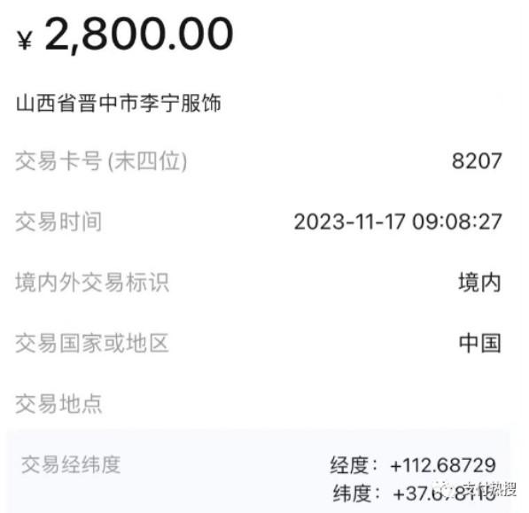 當用戶在刷一筆交易時。尷尬的情況出現了,同一交易地址,經緯度出現了多家商戶。如圖所示:刷卡商戶為山西晉中市李寧服飾,同時顯示出該商戶交易經緯度:經度:+112.68729,維度+37.678115.