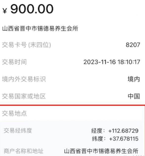 如圖所示:用戶刷卡商戶顯示:山西省晉中市錫德易養生會所。
