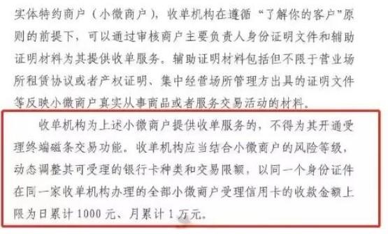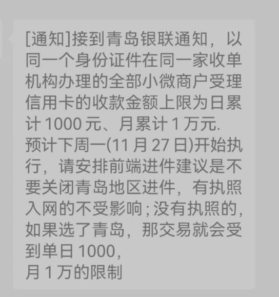 接到青島銀聯(lián)通知,以同一個身份證件在同一家收單機構(gòu)辦理的全部小微商戶受理信用卡的收款金額上限為日累計1000元、月累計1萬元。