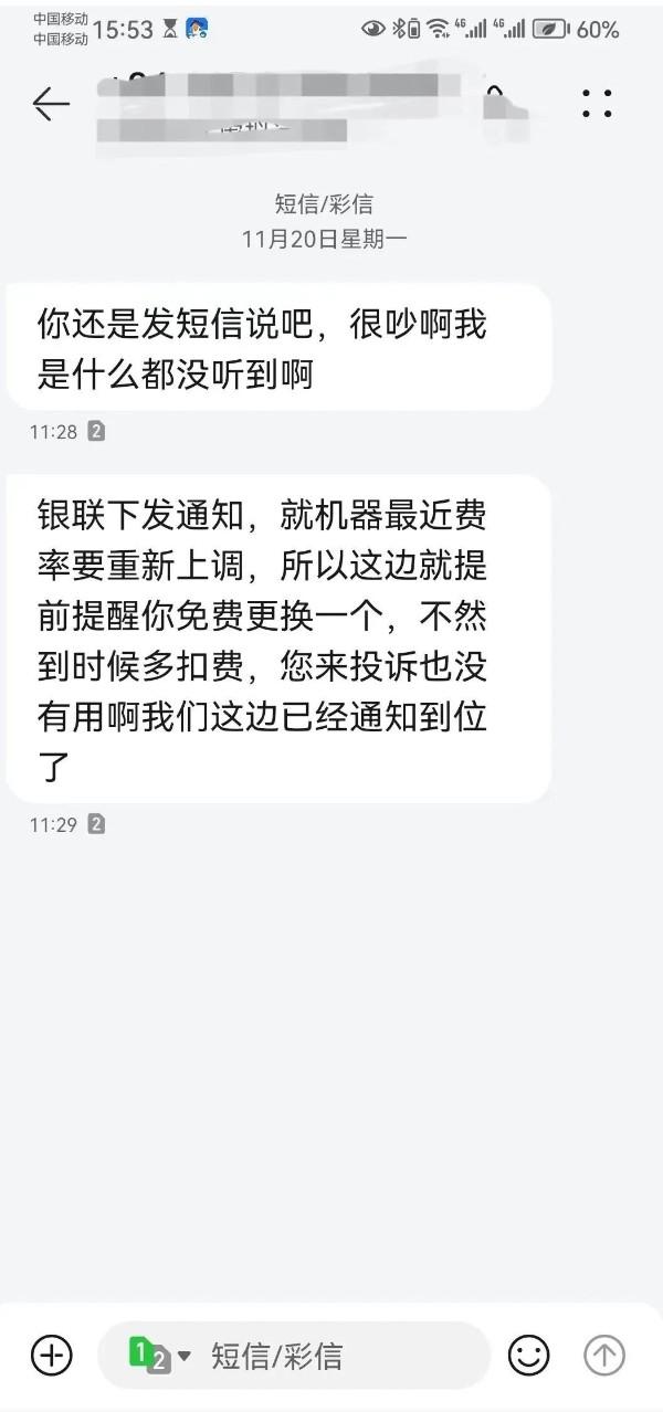 第三天,另一位電銷人員打電話給我。他直接告訴我,我在他們那邊辦理的POS機因為“銀聯一機一商戶政策”的實施要漲費率了,要求我盡快換掉!我感到非常疑惑,于是問他:“我什么時候在你們公司辦理的POS機?辦的是什么牌子的POS機?”這個電銷人員含糊其辭地回答說他不記得了。然后他不斷強調我的POS機會漲手續費,企圖以此恐嚇我。最后,他以我們那邊環境很吵為由掛掉了電話。他還給我發了一條短信,內容和他電話里所說的一樣。