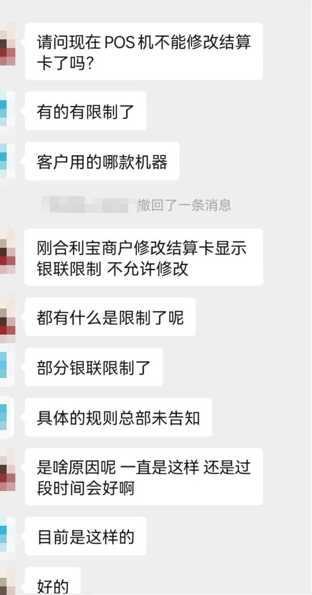 今天,有代理商向小編爆料,合利寶旗下POS產品,被銀聯限制,不允許變更結算卡。具體被限制多久目前未知,對接只回復過段時間可以嘗試變更。
