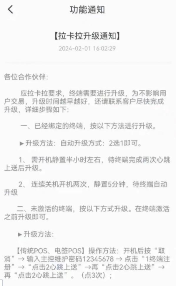 不局限于某個盤某個機構,只要是拉卡拉的機器,一定要先升級再使用!目前已有代理商接到通知,沒有升級的終端費率已經上調了。