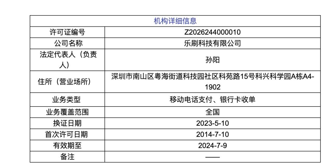 公開資料顯示,樂刷支付成立于2013年,于2014年取得由央行頒發的《支付業務許可證》,可在全國范圍內開展銀行卡收單、移動電話支付業務,有效期至2024年7月9日。