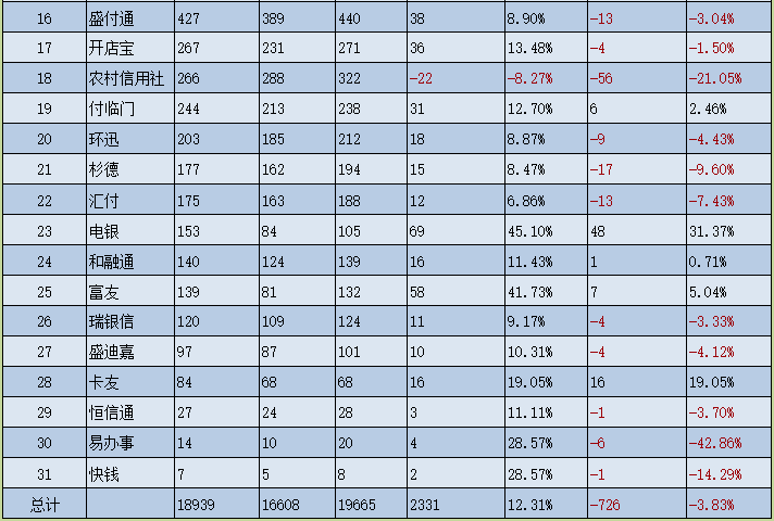 最新數據顯示,今年3月份,上榜的31家POS機支付公司總交易量約為18939億,但相比去年同期,排名前22的支付公司(不含銀商)交易量整體下滑約9000億,降幅達5.3%。更令人震驚的是,與去年3月相比,今年同期的前20名支付公司交易量總和從2.2萬億暴跌至1.50萬億,失去了整整三分之一的市場!這無疑給整個支付行業敲響了警鐘。