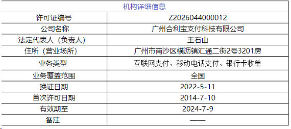 合利寶成立于2013年7月19日,總部位于廣州。合利金融旗下子公司,于2017年被仁東控股收購,并于2019年獲支付牌照續展。合利寶經營范圍包括互聯網支付、移動電話支付、銀行卡收單,展業范圍為全國。