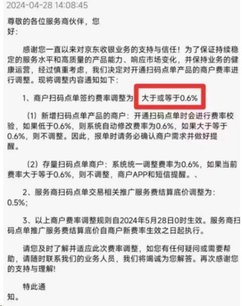 京東收銀發通知對開通掃碼點單產品的商戶費率進行調整,如果商戶掃碼點單簽約費率大于或等于0.6%則不變動,如果商戶掃碼點單簽約費率低于0.6%則調整至0.6%。服務商結算底價調整為0.5%