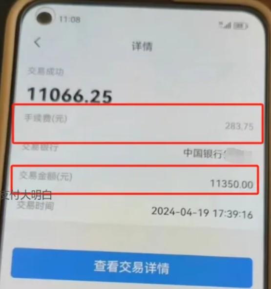 另有客戶,刷卡11350,扣手續(xù)費(fèi)283.75,平均手續(xù)費(fèi)是萬(wàn)250,這差不多是正常手續(xù)費(fèi)的4倍以上了。