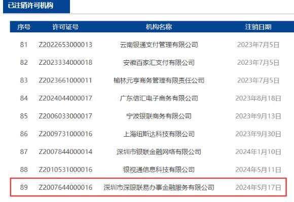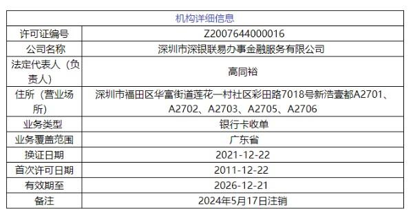 支付牌照被正式注銷:深圳市深銀聯易辦事金融服務有限公司