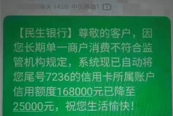 民生銀行,持卡人長期單一商戶消費不符合監管機構規定,16萬額度將至2萬多。
