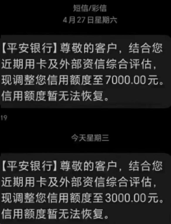 平安銀行,持卡人信用卡由于近期用卡及外部資信綜合評估原因,額度在不到一個月的時間內,被連續兩次降額。